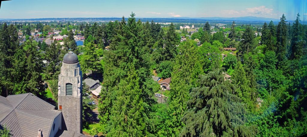 Here he stands with his wife at “The Grotto” in Portland, a Catholic meditation garden. It’s one of the most beautiful and peaceful places you’ll ever find. And I’ll leave this message with one more photo – taken from the Grotto’s meditation chapel — a panorama of North Portland, Washington, the Columbia River and (in the distance) our most recently active volcano — Mt. St. Helens.