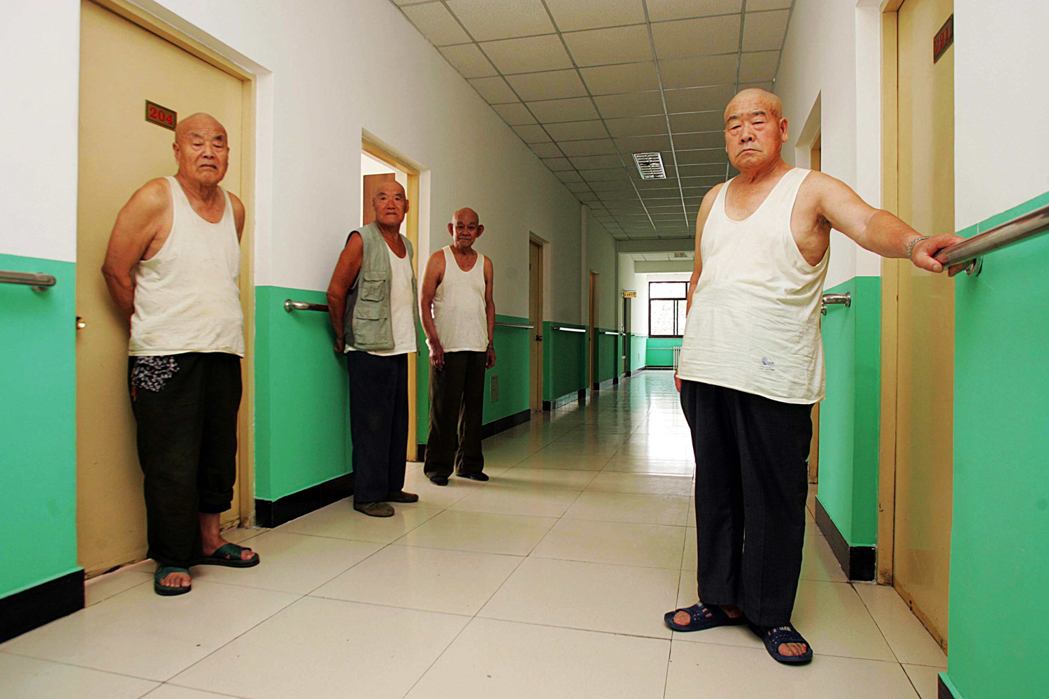 The first picture with the middle-aged men strikes me as very lonely and impersonal. The men are all dressed alike (the green jacket makes this even more clear) and they emerge from identical doors. Yet they are no group. Their circumstances push them together.The surfaces of the building are clean, but hard and merciless. The men’s faces seem interchangeable. They are not so hard. The unsmiling wear of a graceless existence impacts their appearance. None smile. They should be presiding “in family” over the younger generations, their functional apparel exchanged for clothes of honor. Instead, they find themselves cut off and penned up. They don’t appear to be sick, but perhaps some other malady has pricked society into warehousing them this way.