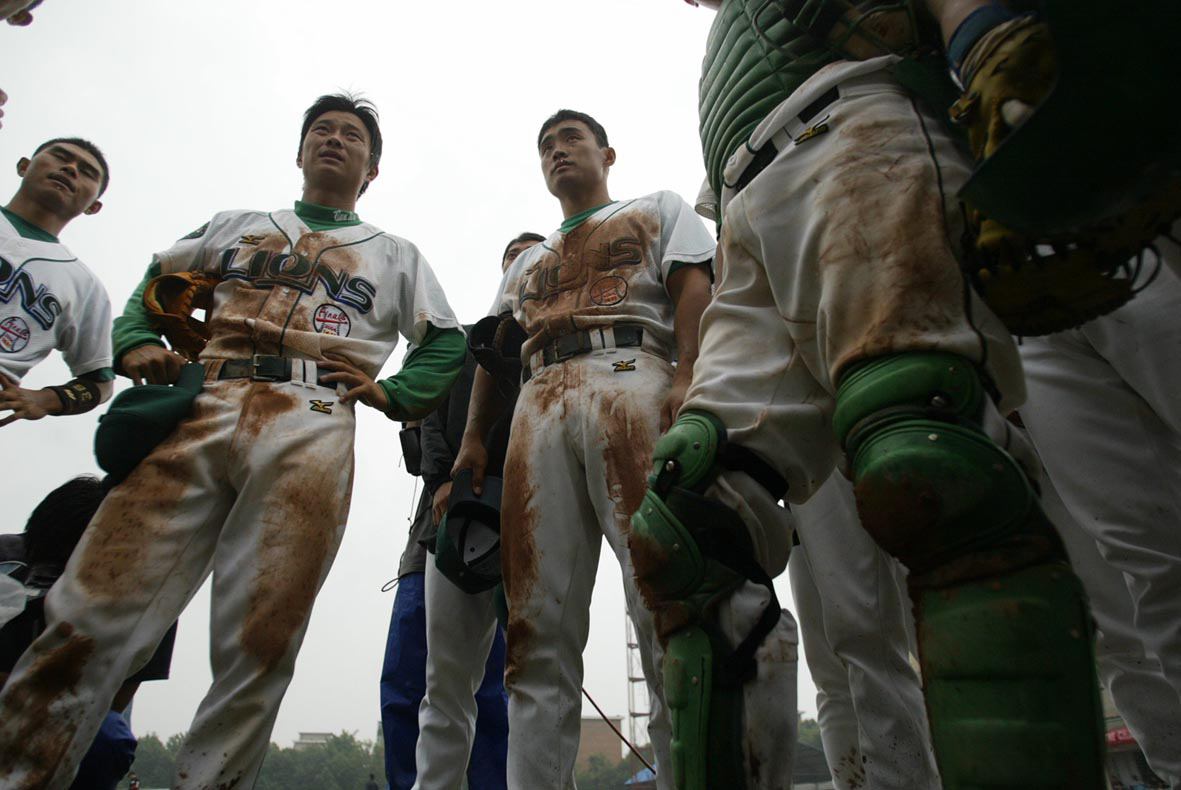 The baseball players, seen from that angle, tower like superheroes. They are dirtied by the mud of good honest effort. The intensity in their faces contrasts with their older peers in the picture above. These young men are strong and confident. The crowd together in a huddle, as a team, intent and purposed. Overconfidence stains the two at left. They lounge with hands on hips, their success guaranteed by merely showing up.Their uniforms, elaborate and colorful, unite them as a team — the Tianjin Lions. I would be tempted to Photoshop a blue sky with racing clouds above their heads.