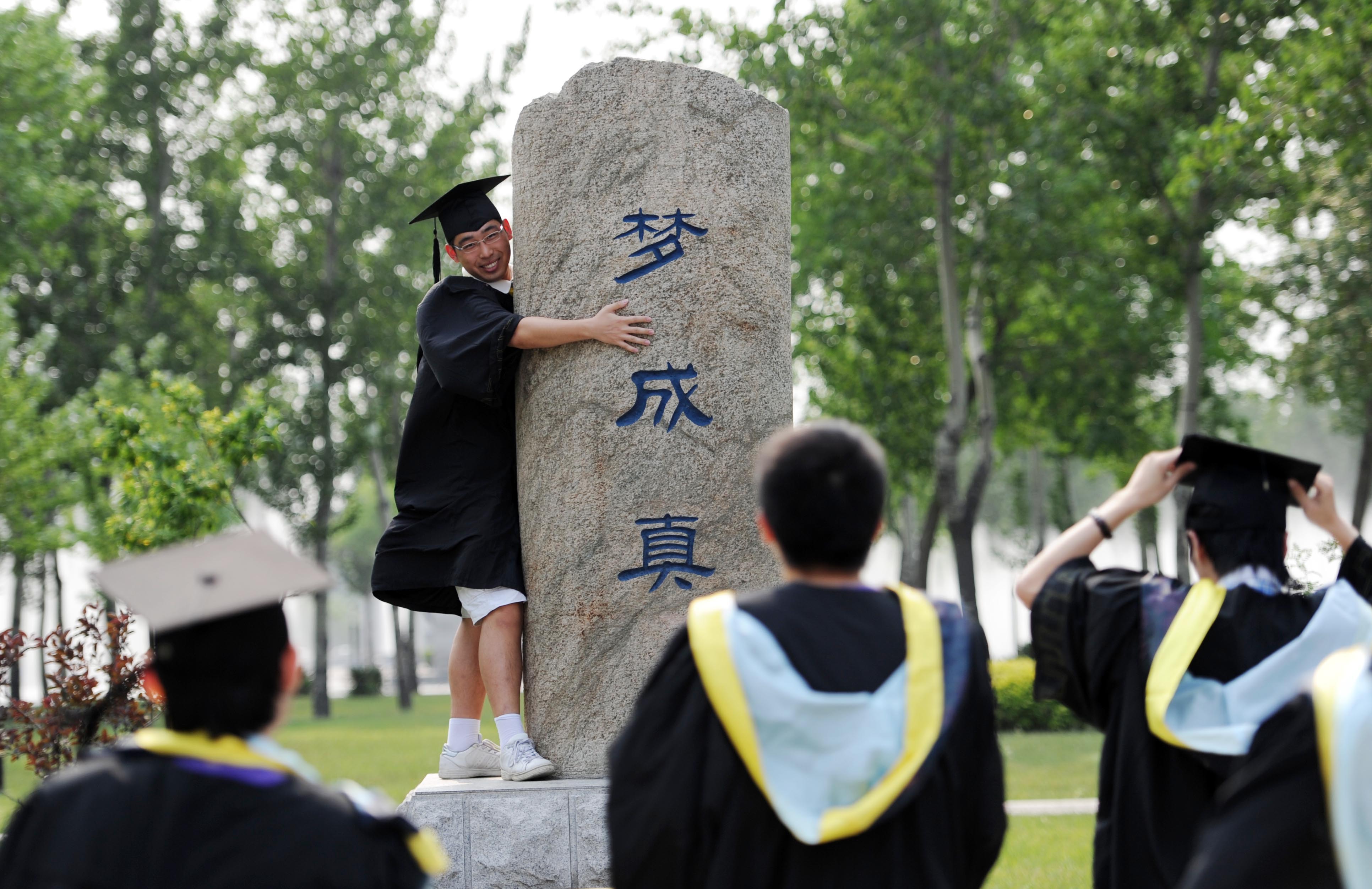 The young graduate clutches his hopes, now fulfilled. As inscribed on the stone, “dreams become reality.” The wind stirs his gown. It is a spirit that will lift him and his stone into a successful life. His smiling face tilts to one side, pressed against the rock like a young boy clinging to his mother. He is carefree. Decorum floats away into the air. The young man on the right, meanwhile, readies his cap, as if planning to fly off next. Or perhaps he’s just gripping it against the wind which streams into him from his highly-placed comrade.