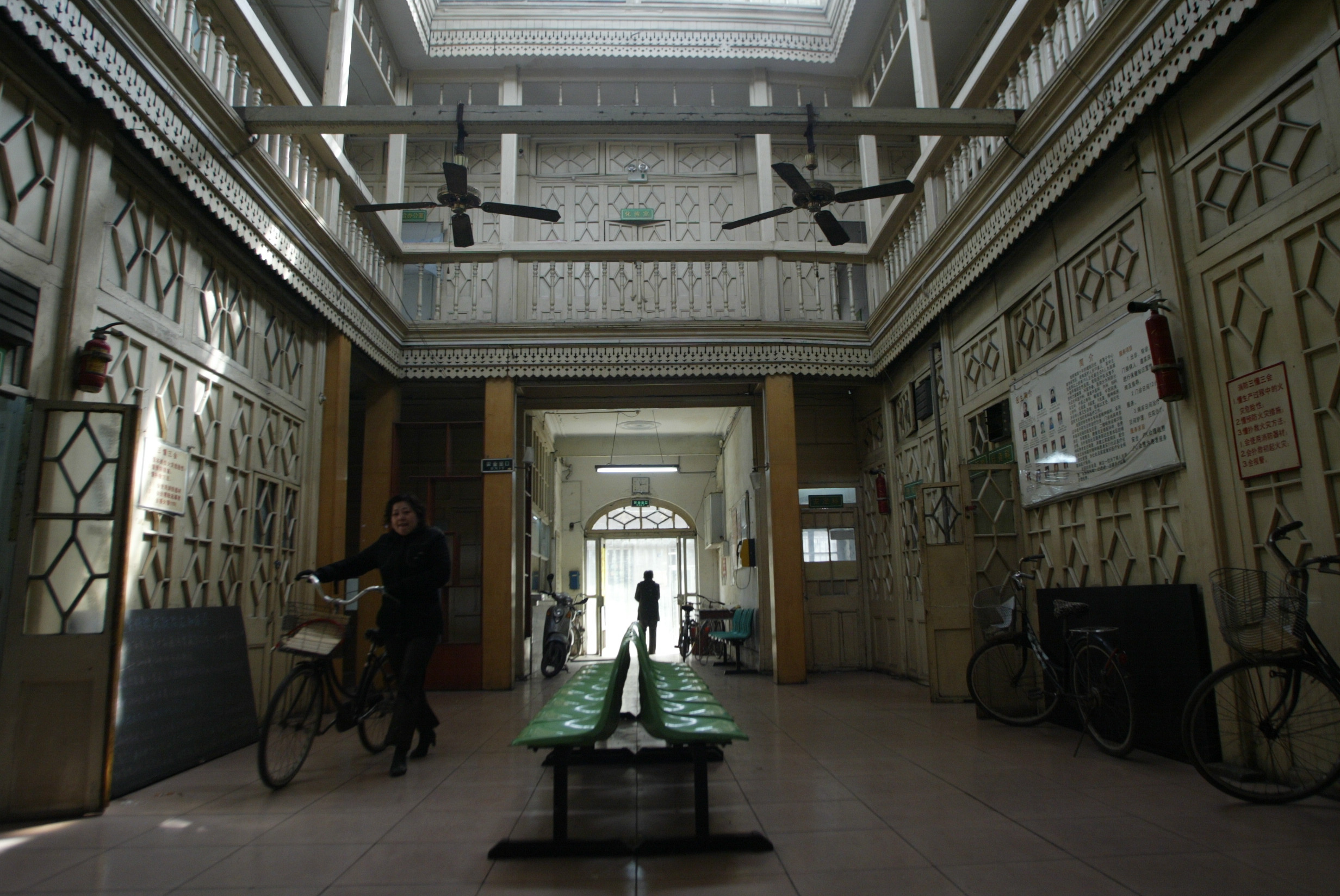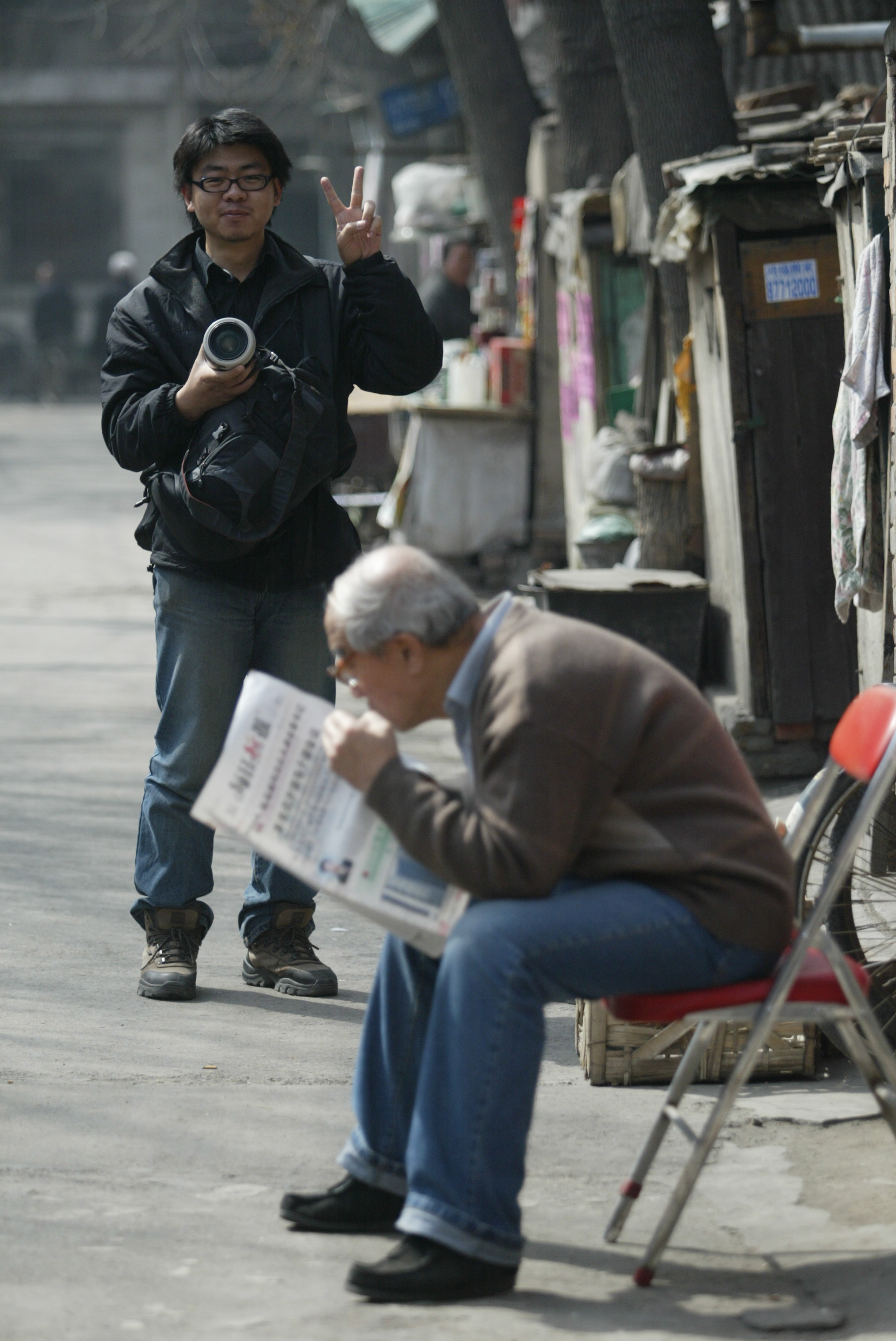 Our mutual friend Du Hai in his days of longer, more tousled, hair, happily flashes a victory sign. He has just bagged a photo, or perhaps is about to bag it. His right hand cradles his weapon. The day is bright, with firm shadows. His quarry rests peacefully, quietly snacking. Does he snack on food, or on the latest news? Deerlike, a brown sweater his coat of fur, he sits out of focus. He is but sustenance for the black-clad panther standing behind him, so close, so happy, so unannounced.A women walks a bicycle respectfully through a temple. What sort of temple is it? The miraculously straight lines of demarcation enclose a lofty space above the fans, above the chandeliers. The space’s white pureness soars in contrast to the muddy browns of the world below.