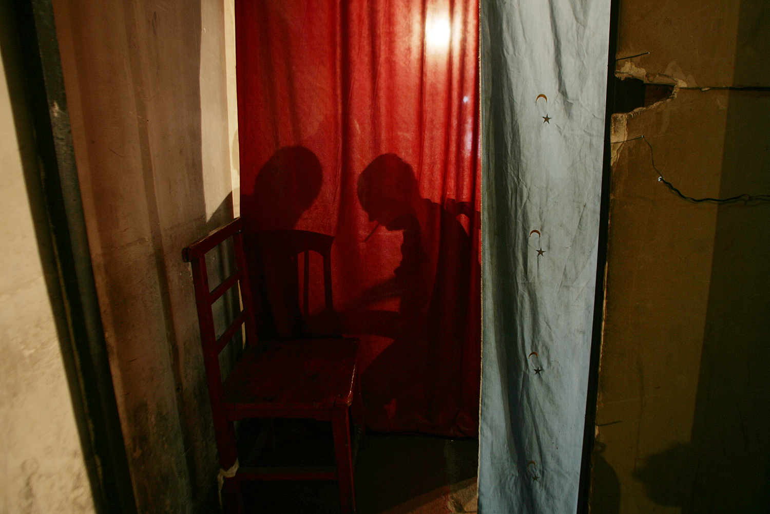 Two figures huddle behind a veil of redness, reduced to shadows. Their hands seem to touch. Perhaps they are paying each other. Perhaps they are taking things. Perhaps they are playing at cards. Perhaps their game will capture winnings for one of them. Perhaps one is a client, and one provides service. One smokes, addicted to nicotine. A bright, hidden light bears down on them. An empty chair stands ready for the next actor in this shadow puppet drama. Additional curtains cover the side walls. What lies behind them?