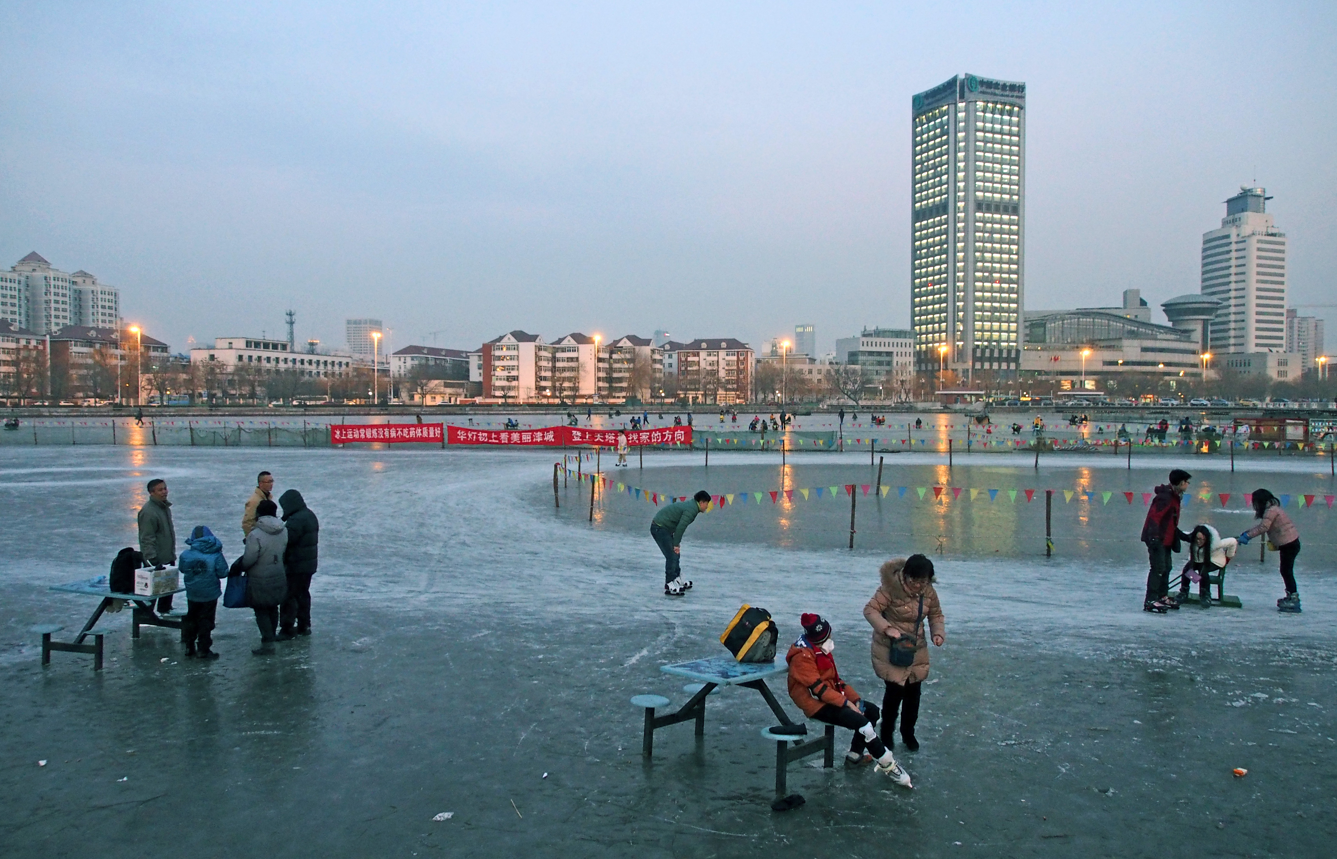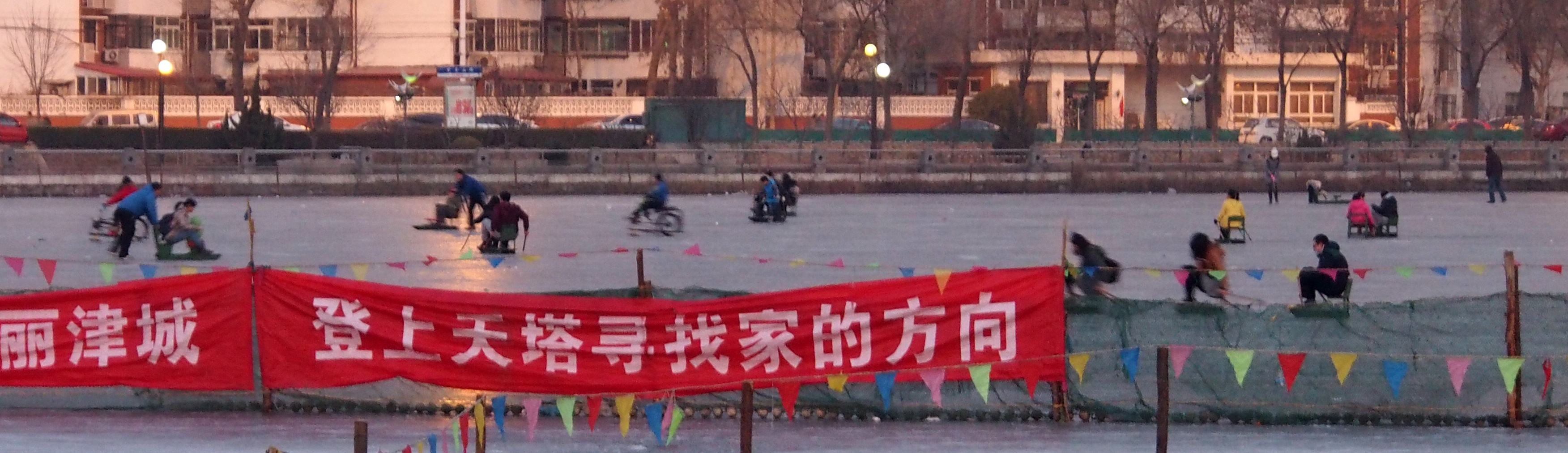The upside to the frozen ponds is the skating. A huge expanse beneath the lofty Tianjin Television Tower is devoted to skating every year. I took this shot a few days ago at dusk. The main skating area is actually in the distance. The shiny roped-off circular area closer to the camera is most likely too thin yet to be safe (?)People here don’t simply skate. They also drive a large variety of sleds and sled-like vehicles. These can be seen by enlarging the picture above. Actually, here is another shot that shows some of them a bit closer up.