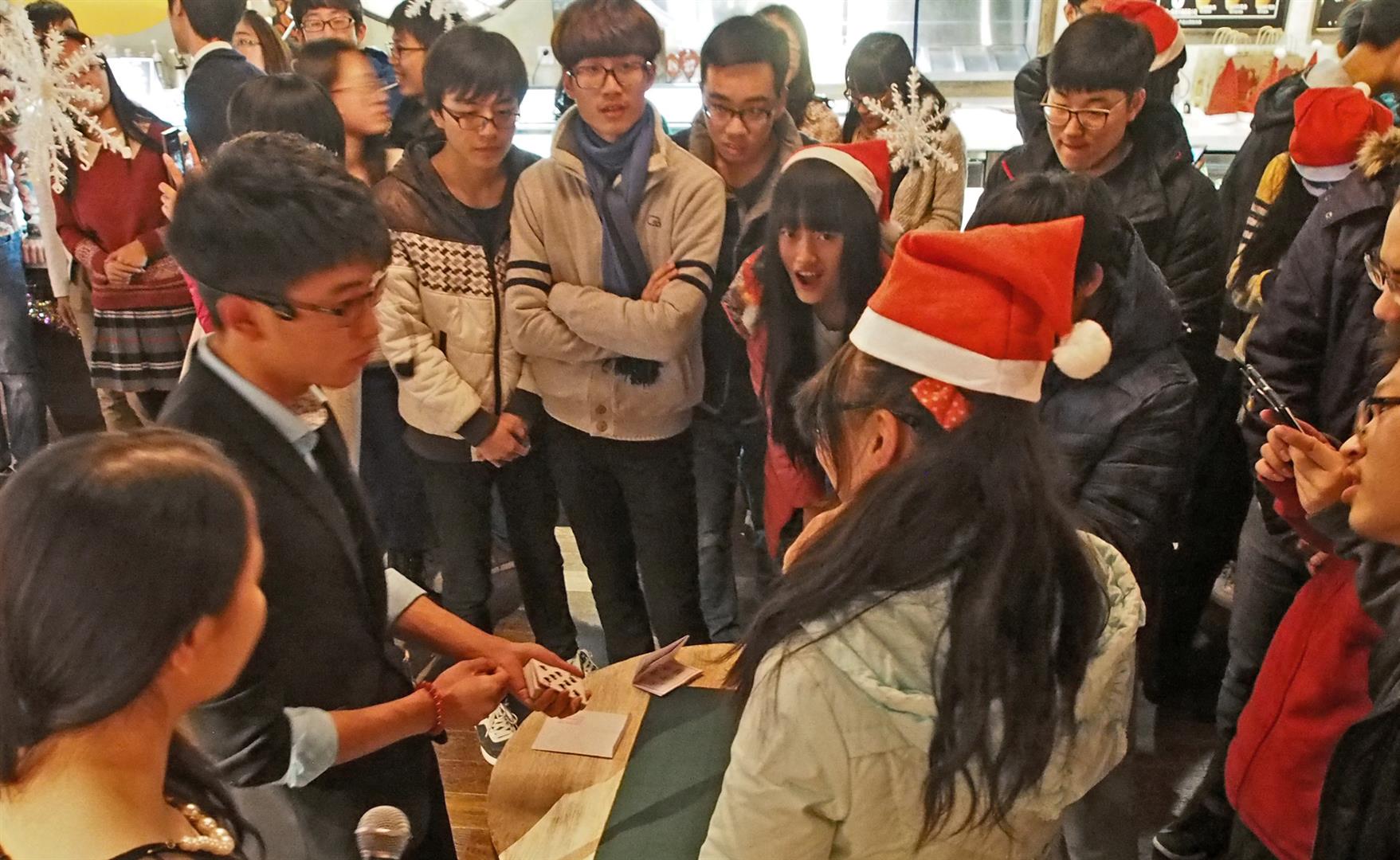 Anyway, these parties, like all annual feasts here, always feature the same activities — lots of games where guests can embarrass themselves singing or performing silly stunts, and some planned performances, such as magicians.Yeah, this year I attended two local Christmas celebrations, and they both featured magicians. Maybe it’s finally time for me to bring my “dove pan” and “linking rings” from home. Anyway, the prestidigitator in the picture at left was pretty handy with card tricks and needle swallowing.
