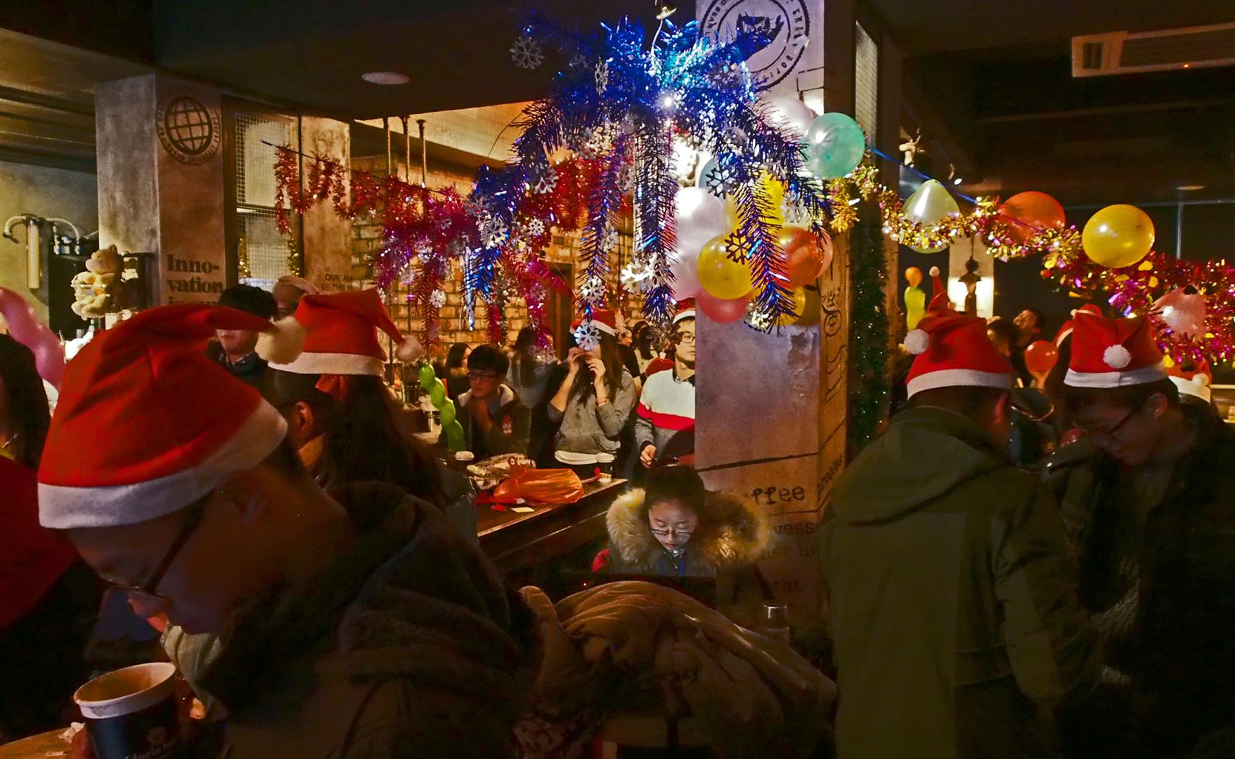 In fact, the picture at right, which portrays students celebrating Christmas at the nearby Gloria Jean’s Coffee , actually got published in a local paper, as part of a conglomeration of Christmas shots. Unfortunately, the design overlapped the pivotal figure, the girl tied to her computer, lost in cyberspace. Can you see her? This obliviousness to actual space is perhaps typical of our modern life everywhere.I always contrast this connected-yet-isolated condition with my many trips to Europe back in the old days, when nobody could get in touch with me for months at a time. What a different world. Everyone I interacted with on those trips actually interacted with me.