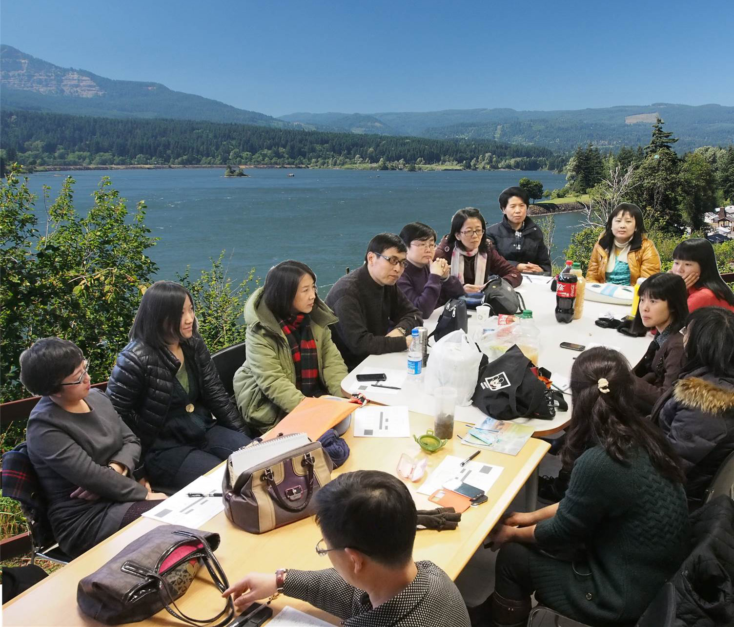 So here’s our faculty meeting that took place this week at the new campus site, far away from everything else in the world.Just kidding. Actually, we all jetted out to the Columbia River near Portland for our meeting. That’s Washington in the background.